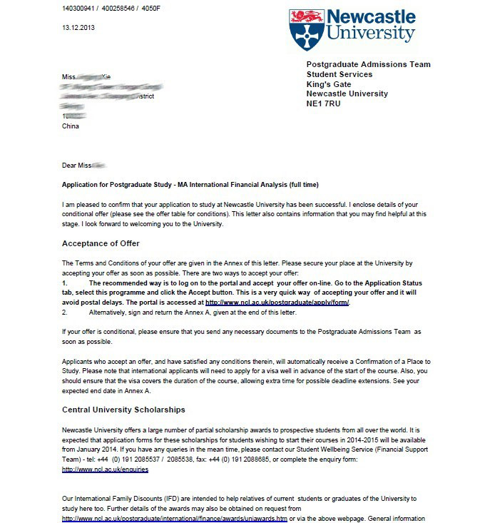 恭喜成同學成功獲得紐卡斯特大學國際金融學碩士專業錄取通知書-優越教育