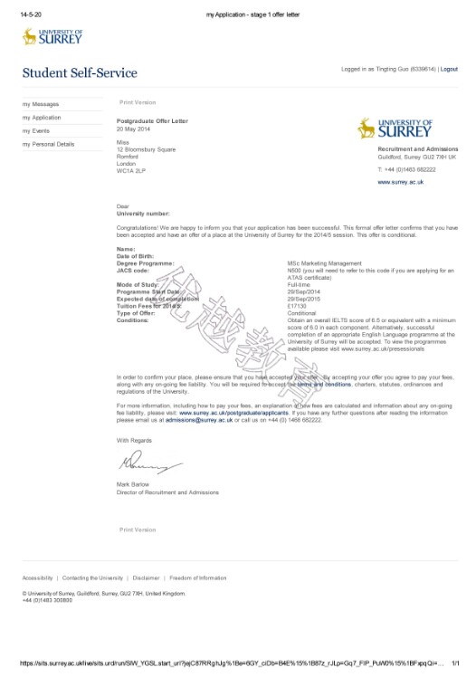 恭喜優(yōu)越教育成功幫助這位郭同學(xué)成功申請到薩里大學(xué)研究生市場管理專業(yè),歡迎隨時在線咨詢優(yōu)越教育,我們的客服24小時在線,感謝您的咨詢!