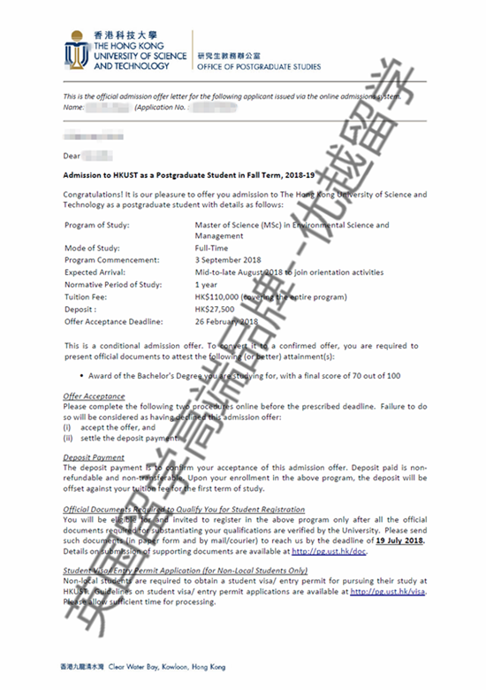 2018offer:恭喜韓同學獲得香港科技大學環境科學與管理專業碩士通知書