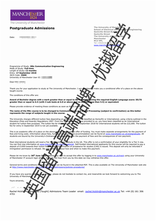 2018offer:恭喜胡同學(xué)獲得曼徹斯特大學(xué)通信工程專業(yè)碩士通知書