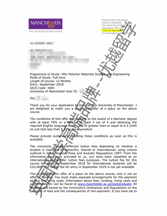 2018offer:恭喜韓同學(xué)獲得曼徹斯特大學(xué)高分子材料科學(xué)與工程專業(yè)碩士通知書