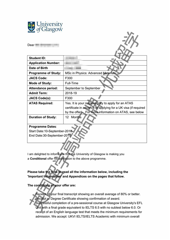 2018offer:恭喜吳同學(xué)獲得格拉斯哥大學(xué)高等材料科學(xué)專業(yè)碩士通知書