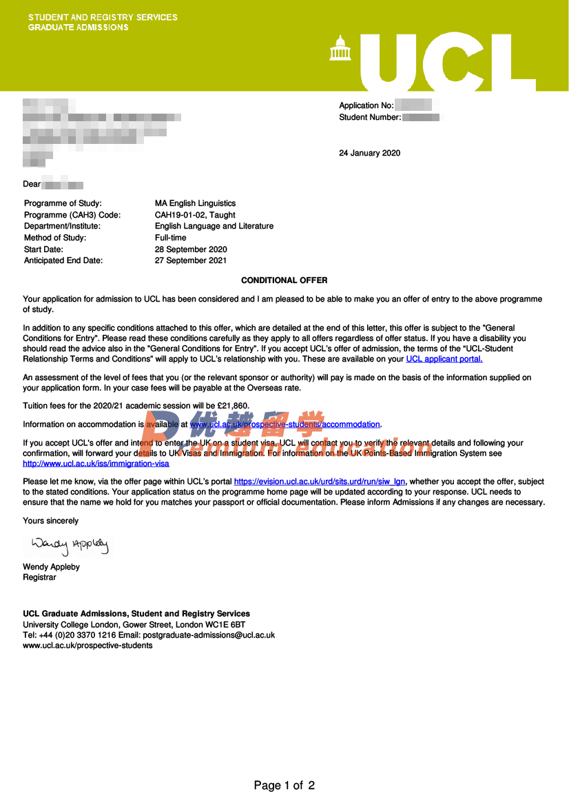 2020offer:恭喜朱同學獲得倫敦大學學院英語語言學專業碩士通知書