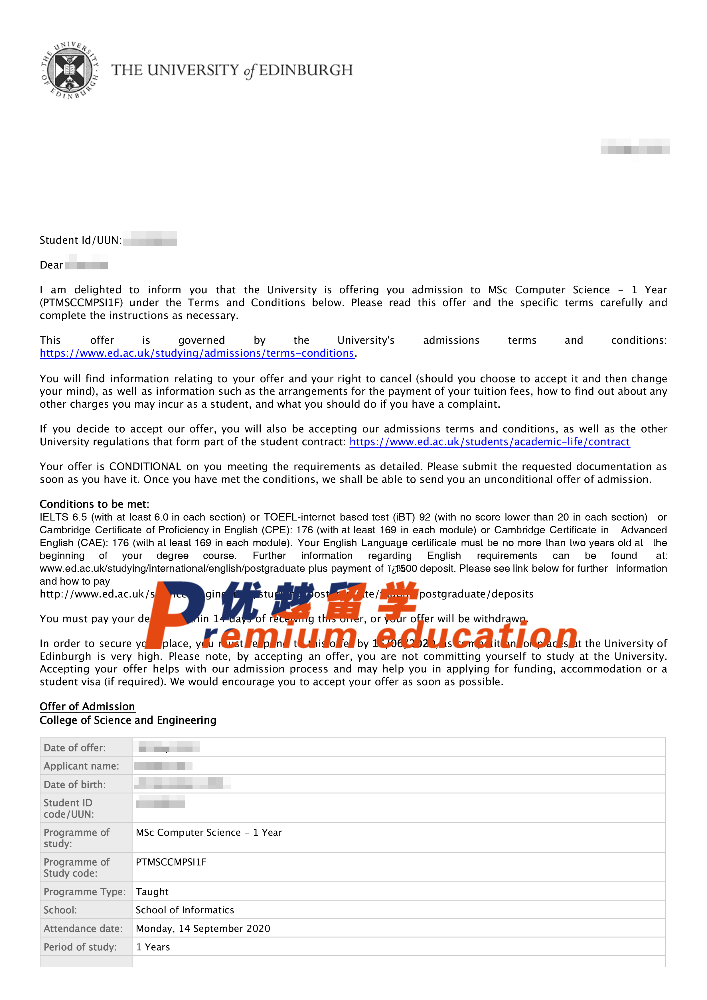 2020offer:恭喜陳同學獲得愛丁堡大學計算機科學專業碩士通知書