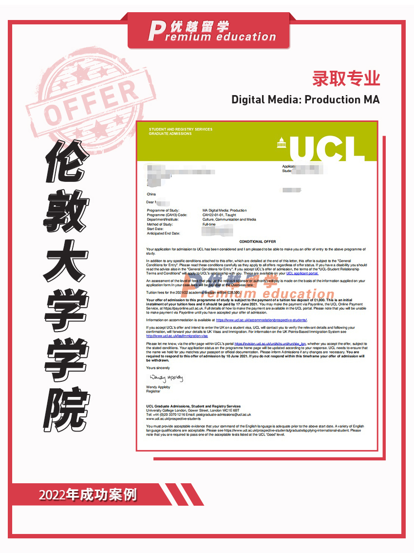2021offer:恭喜柳同學獲得倫敦大學學院數(shù)字媒體專業(yè)碩士通知書