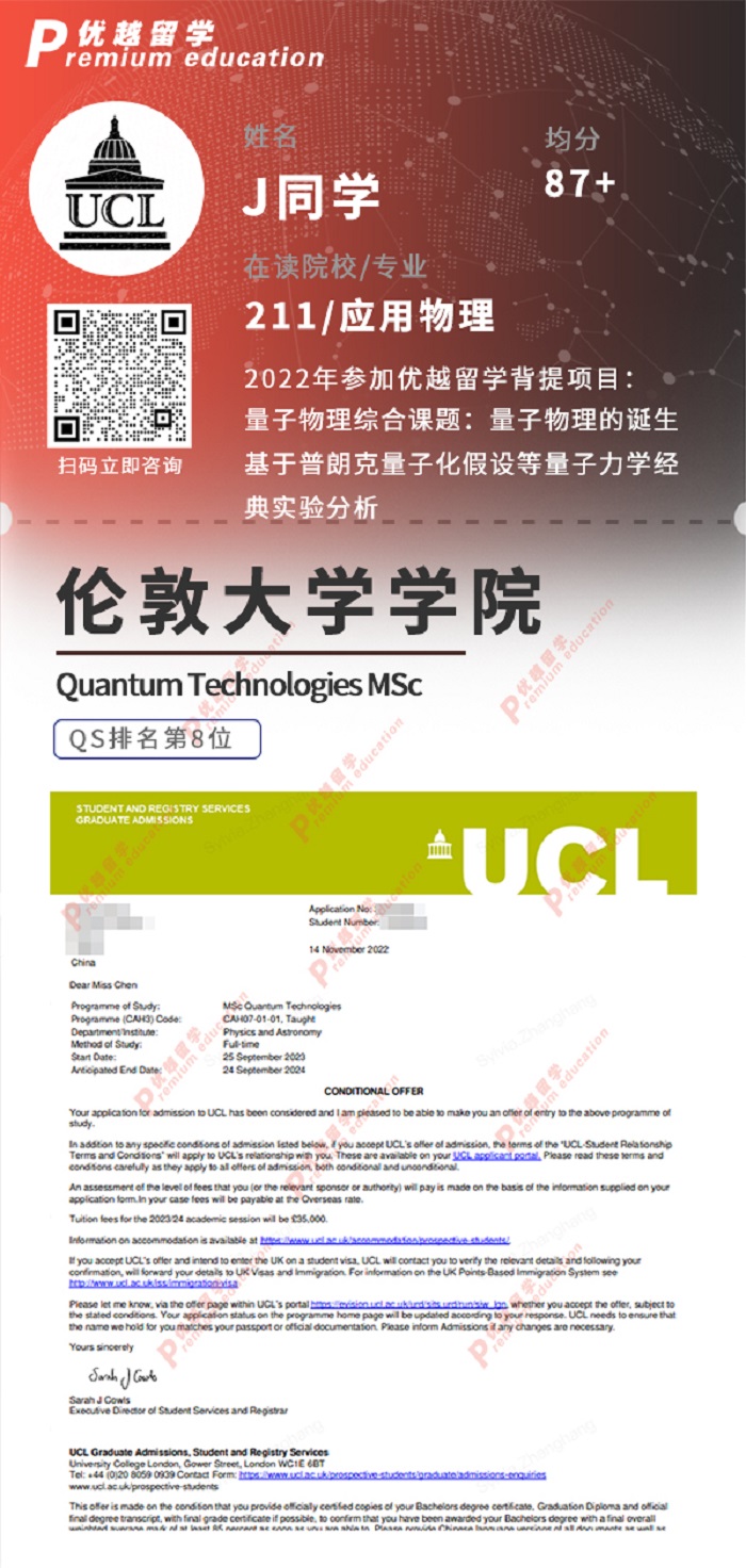 2023offer:恭喜J同學獲得倫敦大學學院量子技術理學碩士通知書!