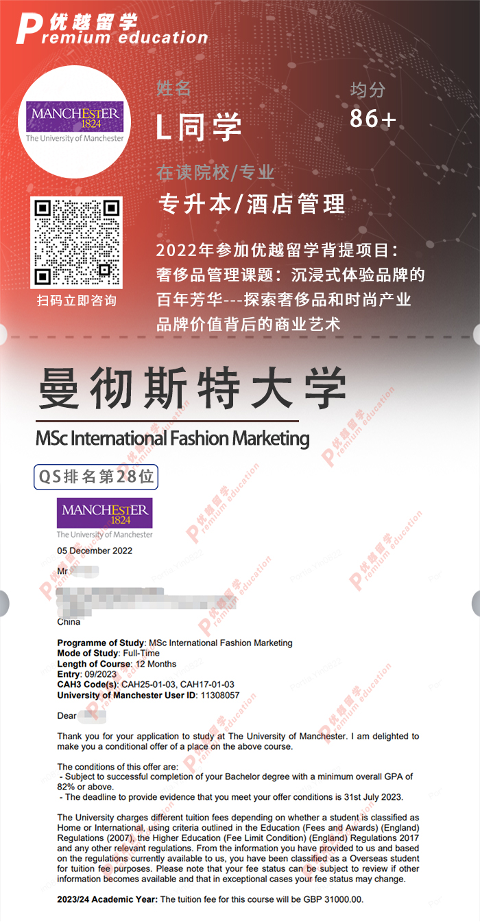2023offer:恭喜L同學在碩士留學申請中獲得曼徹斯特大學國際時尚營銷碩士通知書
