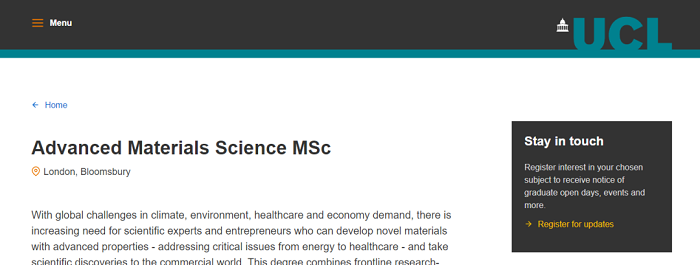 2.該學位結合了UCL的一線研究型教學,以培養下一代材料科學家。該計劃專為具有物理、化學、聚合物、材料科學或生物學背景的學生而設計,旨在幫助學生為發現將塑造我們世界未來的先進材料的職業做好準備。