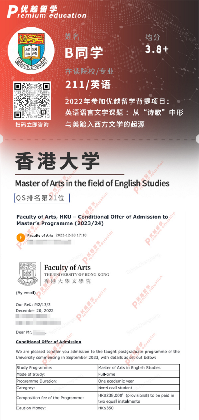 2023offer:恭喜B同學獲得香港大學英語研究碩士通知書。