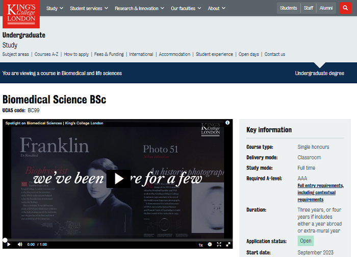 生物醫學科學理學士跨學科學位是KCL最受歡迎的生物科學課程,每年有超過300名學生入學。該課程始終提供高質量的教學,學生可以選擇個人科學優勢和興趣的學位課程。本課程是生物科學教育學院“Common Year 1”系列課程的一部分。該套件中的其他程序是解剖學、發育和人類生物學;生物化學;醫學生理學;分子遺傳學;神經科學;和藥理學。成功完成第一年后,學生可以選擇切換到該套件中的另一個程序。在第2年,學生可以選擇在學校的合作機構之一出國學習一個學期?;蛘呖梢陨暾堅诘诙旰偷谌曛g在通常是在國外或校外領先的生物醫學雇主那里學習一年。