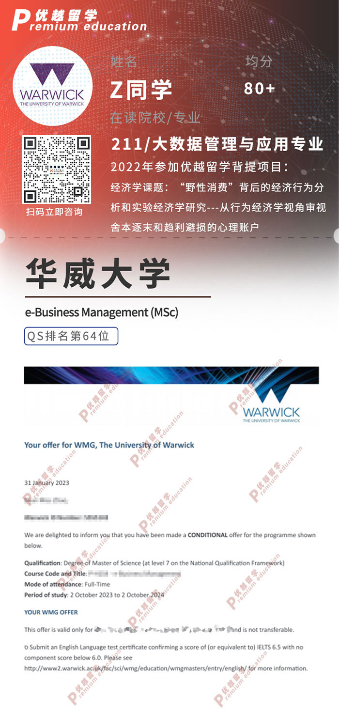 2023offer:恭喜Z同學在碩士留學申請中獲得華威大學電子商務管理碩士通知書!