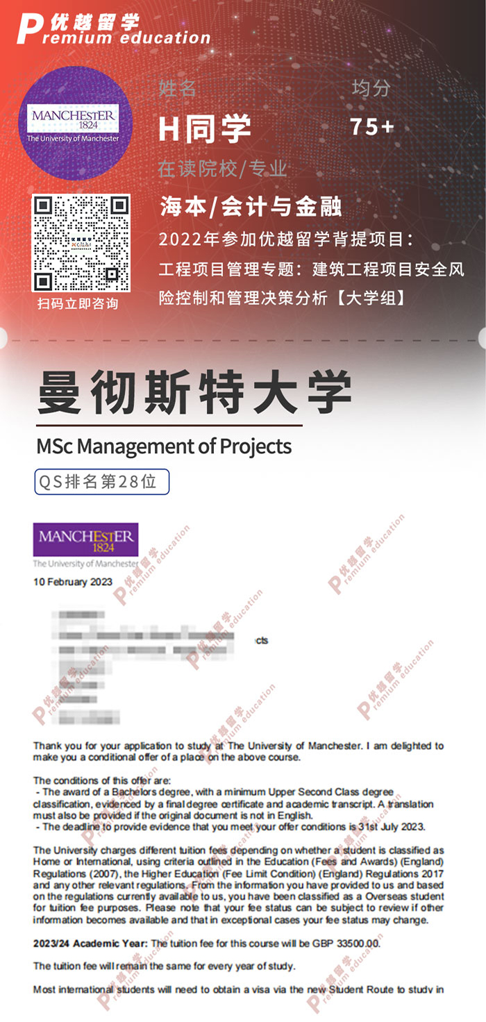 2023offer:恭喜H同學在碩士留學申請中獲得曼徹斯特大學項目管理碩士通知書!