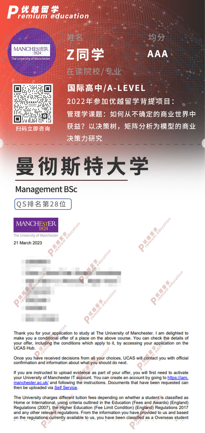 2023offer來襲!恭喜Z同學在本科留學申請中斬獲曼徹斯特大學管理學學士通知書!