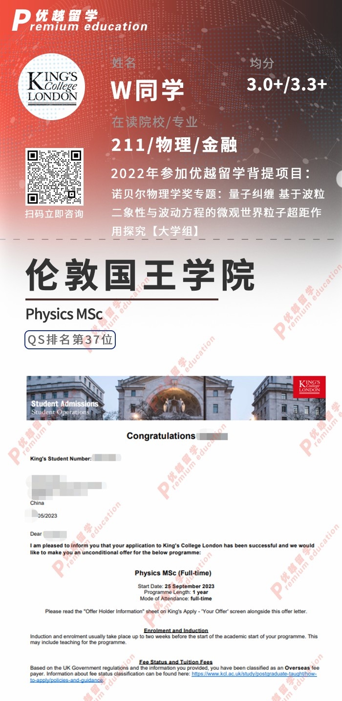 2023offer來襲!恭喜W同學(xué)在碩士留學(xué)申請中斬獲倫敦國王學(xué)院KCL物理學(xué)碩士通知書!