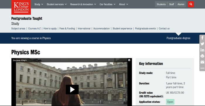 倫敦國王學(xué)院的物理學(xué)碩士課程的優(yōu)勢在于:該課程在英國物理學(xué)排名前 10 位(2022 年 QS 世界學(xué)科排名);該課程中以研究為主導(dǎo)的課,都由領(lǐng)域公認(rèn)的領(lǐng)導(dǎo)者教授;對實驗物理學(xué)感興趣的學(xué)生有機會學(xué)習(xí)最先進(jìn)的實驗納米等離子體學(xué)、生物成像、近場光學(xué)和納米光子學(xué),并進(jìn)入倫敦納米技術(shù)中心(LCN)的實驗室,且有機會參加學(xué)院在光子學(xué)和超材料方面的旗艦課程;對于對理論物理感興趣的學(xué)生,有機會參加學(xué)院的標(biāo)準(zhǔn)模型物理與超越和高級凝聚態(tài)的旗艦課程。