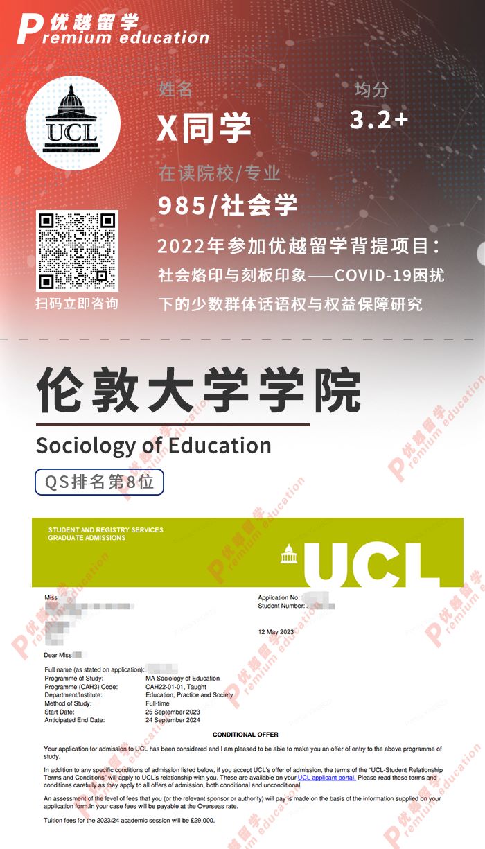 2023offer來襲!恭喜F同學在碩士留學申請中斬獲倫敦大學學院UCL教育社會學碩士通知書!