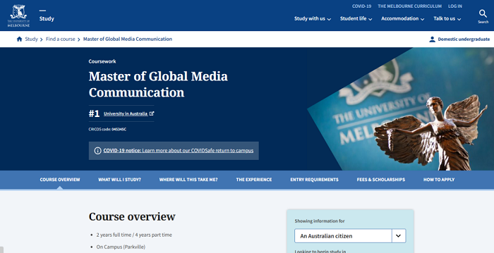 墨爾本大學(xué)的全球媒體傳播碩士專為那些意識到跨國媒體傳播變化,并對學(xué)習(xí)如何辯論和探索這些實踐有濃厚興趣的人而設(shè)計。且在新聞、廣播、數(shù)字媒體和專業(yè)傳播領(lǐng)域建立并重新創(chuàng)建學(xué)生自己的當代寫作和媒體制作方法。學(xué)生還有機會在麥吉爾大學(xué)(蒙特利爾)、洪堡大學(xué)(柏林)或復(fù)旦大學(xué)(上海)等國際領(lǐng)先大學(xué)進行可選的海外交流學(xué)期來豐富個人的經(jīng)驗。