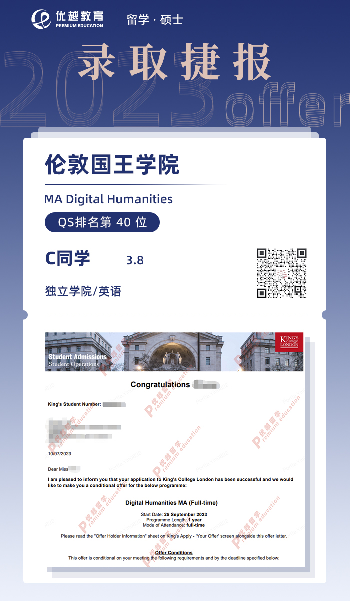 2023offer來襲!恭喜C同學在碩士留學申請中斬獲倫敦國王學院KCL數字人文專業碩士通知書!
