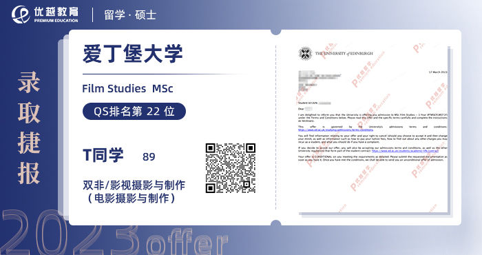 2023offer來襲!恭喜T同學在碩士留學申請中斬獲愛丁堡大學電影研究碩士通知書!