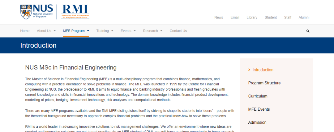 金融工程理學碩士(MFE)是一個多學科項目,將金融、數學和計算機結合起來,以解決金融問題的實踐為導向。MFE由新加坡國立大學金融工程中心(RMI 的前身)1999年推出,旨在為金融和銀行業專業人士和應屆畢業生提供金融創新和技術方面的最新知識和技能。領域知識包括金融產品開發、價格建模、對沖、投資技術、風險分析和計算方法。