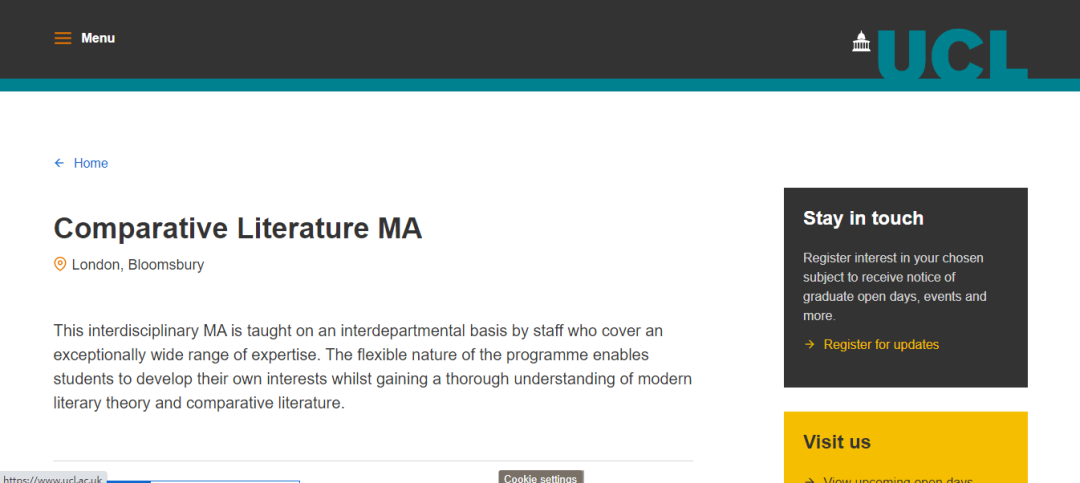 憑借獨(dú)特的現(xiàn)代和古代語(yǔ)言和文化,倫敦大學(xué)學(xué)院利用藝術(shù)與人文學(xué)院、社會(huì)與歷史科學(xué)學(xué)院、教育學(xué)院、斯拉夫?qū)W院專家的集體專業(yè)知識(shí),為比較文學(xué)研究提供了一個(gè)全面的環(huán)境。
