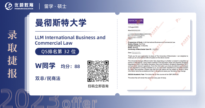 2023offer來襲!恭喜W同學(xué)在碩士留學(xué)申請(qǐng)中斬獲曼徹斯特大學(xué)國(guó)際商法碩士通知書!