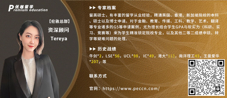 本案例的留學(xué)顧問是優(yōu)越倫敦的Tereya老師,留英碩士,有豐富的留學(xué)從業(yè)經(jīng)驗(yàn),稍通英國、香港、新加坡院校的本科碩士以及博士申請(qǐng)。對(duì)于金融、教育、傳媒、工科、數(shù)學(xué)、藝術(shù)、翻譯等專業(yè)諸多的G5等申請(qǐng)案例,尤為擅長(zhǎng)結(jié)合學(xué)生GPA與軟實(shí)力 《科研、實(shí)習(xí)、競(jìng)賽等)來為學(xué)生精準(zhǔn)鎖定院校專業(yè),以及其他二等二成編申碩、轉(zhuǎn)學(xué)等疑難問題的處理。