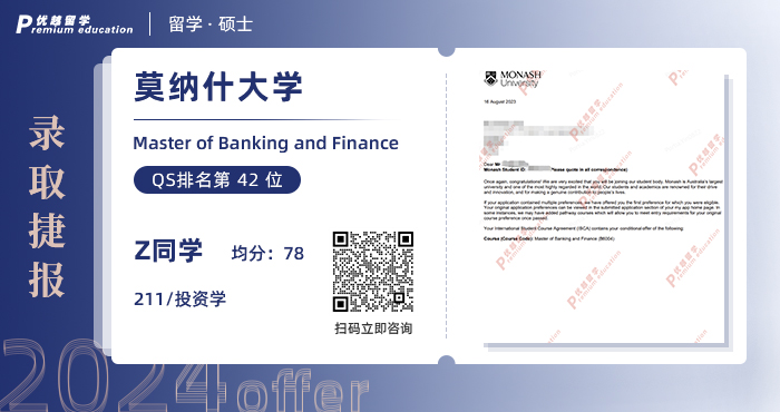 2024offer來襲!恭喜Z同學在碩士留學申請中斬獲莫納什大學銀行和金融碩士通知書!