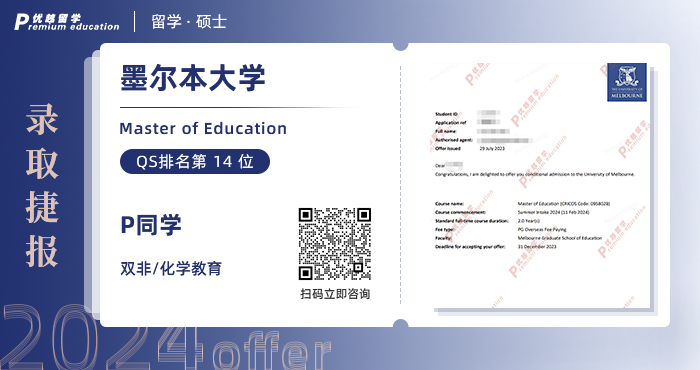 2024offer來襲!恭喜P同學在碩士留學申請中斬獲墨爾本大學教育學碩士通知書!