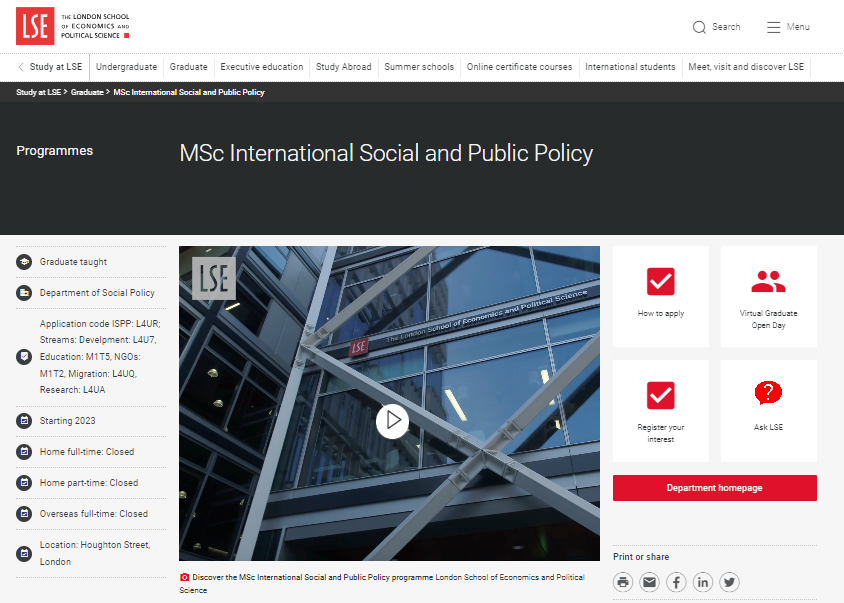 ISPP計劃致力于解決國家和社會如何應對社會、人口和經濟變化以及貧困、移民和全球化等全球挑戰。它以倫敦經濟學院的社會和公共政策方法為基礎,該方法具有明確的國際性、跨學科性和應用性。 滿足人類需求和增加福祉是普遍的政策目標,但世界各地對這些目標的處理方式有所不同,政府、非政府組織、家庭和市場等關鍵利益相關者也扮演著不同的角色。ISPP從國際和比較的角度來處理政策過程。著眼于低收入、中等收入和高收入國家,學生將獲得識別關鍵社會挑戰、分析用于解決這些挑戰的社會和公共政策以及不同參與者在這些過程中的作用的技能。