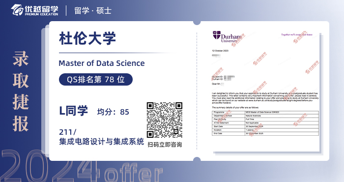 2024offer來襲!恭喜L同學在碩士留學申請中斬獲杜倫大學數據科學碩士通知書!