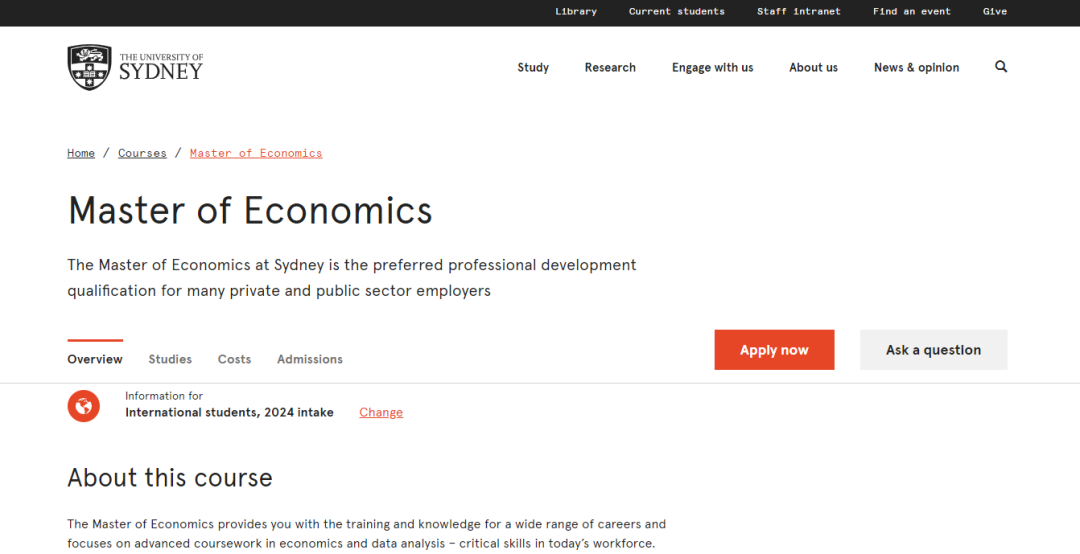 悉尼大學的經濟學碩士課程專為應屆畢業生以及為職業發展或轉行而尋求進一步經濟學培訓的專業人士而設計,鼓勵學生以實用的方式應用所學知識,應對商業和政策領域的重大挑戰。經濟學碩士課程為學生提供從事各種職業所需的培訓和知識,重點是經濟學和數據分析方面的高級課程,這些都是當今勞動力市場的關鍵技能。