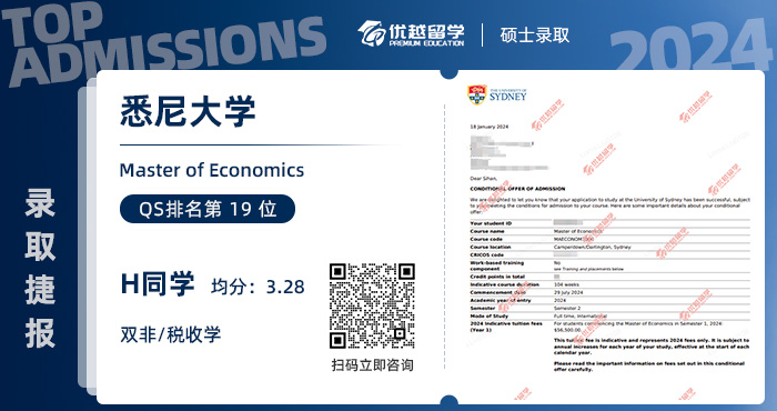 2024offer來襲!恭喜H同學在碩士留學申請中斬獲悉尼大學經濟學碩士通知書!