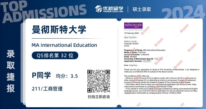 經歷2個月的等待后,投遞的院校都陸續發來的offer,P學長最終出于院校排名考慮,選擇了綜排更高的曼大,也祝P學長未來學業順利!