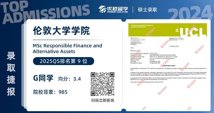 在Ninal老師的安排下,G學長的實習和材料準備工作同步進行。待到8月底,G學長拿到實習證明的時候,文書材料也定稿交付了,只待院校開放通道,便可完成遞交。今年2月,G學長收到了UCL的offer,圓夢成功!