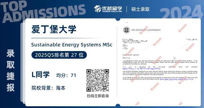 L學(xué)長(zhǎng)本科畢業(yè)于海外一所大學(xué)機(jī)械建造專(zhuān)業(yè),鑒于成績(jī)優(yōu)異,英國(guó)碩士申請(qǐng) 過(guò)程十分順利,3個(gè)月拿下4枚offer,包括愛(ài)丁堡大學(xué)可持續(xù)能源系統(tǒng)碩士項(xiàng)目。下面來(lái)看看offer詳情吧~