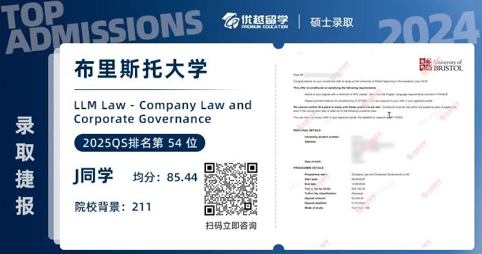 以上是【【布里斯托大學】211法學專業,順利錄取布大公司法與公司治理LLM】相關的全部內容,查看更多【offer榜單】、【名校案例】相關資訊可前往【優越留學】首頁!世界名校申請,找優越留學!選校定校、申請規劃、文書寫作、背景提升、方案定制一套搞定!點擊【在線咨詢】,優越留學顧問24h在線為您一對一解答!