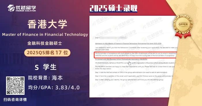以上是【【香港大學】優越留學學員斬獲金融科技金融碩士offer(提前批) 】相關的全部內容,查看更多【offer榜單】、【名校案例】相關資訊可前往【優越留學】首頁!世界名校申請,找優越留學!選校定校、申請規劃、文書寫作、背景提升、方案定制一套搞定!點擊【在線咨詢】,優越留學顧問24h在線為您一對一解答!