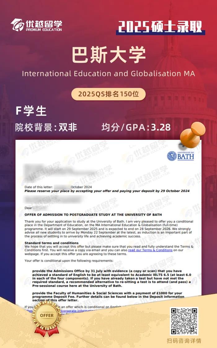 當(dāng)前位置: 首頁 > 關(guān)于優(yōu)越 > 錄取榜單 > 25fall碩士offer上新:雙非英專生錄取【巴斯大學(xué)】國際教育與全球化碩士