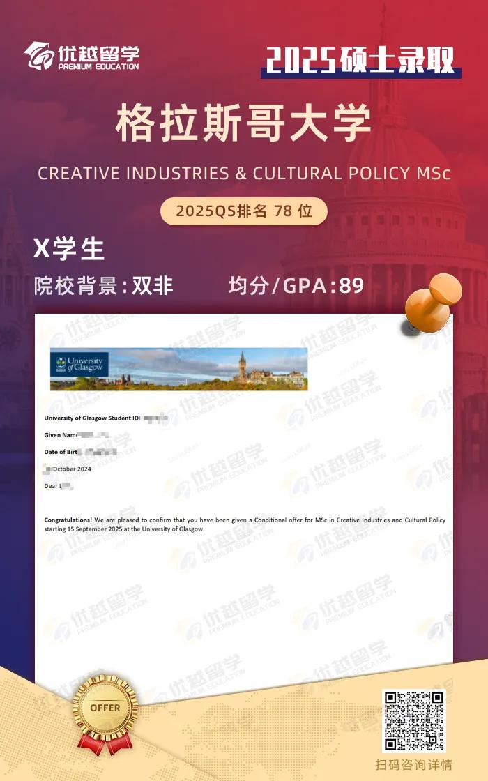 以上是【25fall英國offer上新!雙非錄取【格拉斯哥大學】創意產業與文化政策專業】相關的全部內容,查看更多【offer榜單】、【名校案例】相關資訊可前往【優越留學】首頁!世界名校申請,找優越留學!選校定校、申請規劃、文書寫作、背景提升、方案定制一套搞定!點擊【在線咨詢】,優越留學顧問24h在線為您一對一解答!