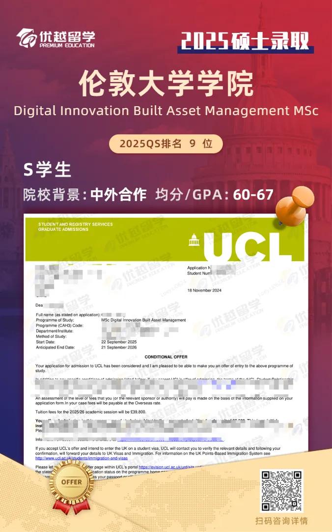 以上是【25fall英國offer+1!中外合作錄取【倫敦大學(xué)學(xué)院UCL】數(shù)字創(chuàng)新構(gòu)建資產(chǎn)管理碩士】相關(guān)的全部內(nèi)容,查看更多【offer榜單】、【名校案例】相關(guān)資訊可前往【優(yōu)越留學(xué)】首頁!世界名校申請,找優(yōu)越留學(xué)!選校定校、申請規(guī)劃、文書寫作、背景提升、方案定制一套搞定!點(diǎn)擊【在線咨詢】,優(yōu)越留學(xué)顧問24h在線為您一對一解答!