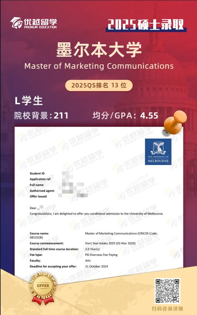 以上是【25澳洲碩士offer上新:211錄取【墨爾本大學】市場營銷傳播專業(yè)!】相關的全部內容,查看更多【offer榜單】、【名校案例】相關資訊可前往【優(yōu)越留學】首頁!世界名校申請,找優(yōu)越留學!選校定校、申請規(guī)劃、文書寫作、背景提升、方案定制一套搞定!點擊【在線咨詢】,優(yōu)越留學顧問24h在線為您一對一解答!