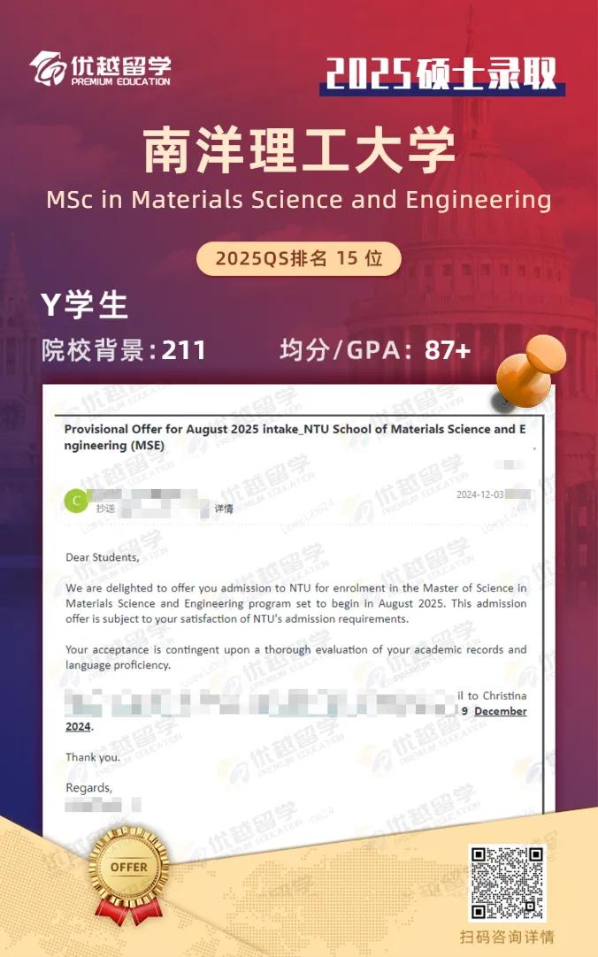 以上是【25fall新加坡留學中介offer+1:【南洋理工大學】商業碩士專業】相關的全部內容,查看更多【offer榜單】、【名校案例】相關資訊可前往【優越留學】首頁!世界名校申請,找優越留學!選校定校、申請規劃、文書寫作、背景提升、方案定制一套搞定!點擊【在線咨詢】,優越留學顧問24h在線為您一對一解答!