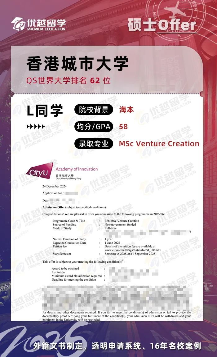 恭喜優越學員碩士研究生申請首戰告捷,拿下香港城市大學風險創建碩士offer。接下來,就跟優越君一起看看這位同學的上岸歷程~