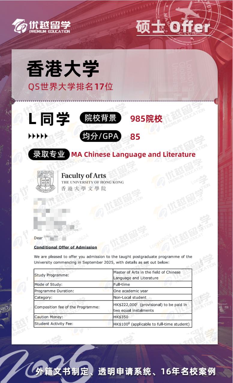 L同學是去年考完研來到優(yōu)越的,用時1個月的時間準備香港碩士留學申請,最終上岸港大中國語言文學專業(yè)碩士項目。接下來,就跟優(yōu)越君一起看看這位同學的上岸歷程~