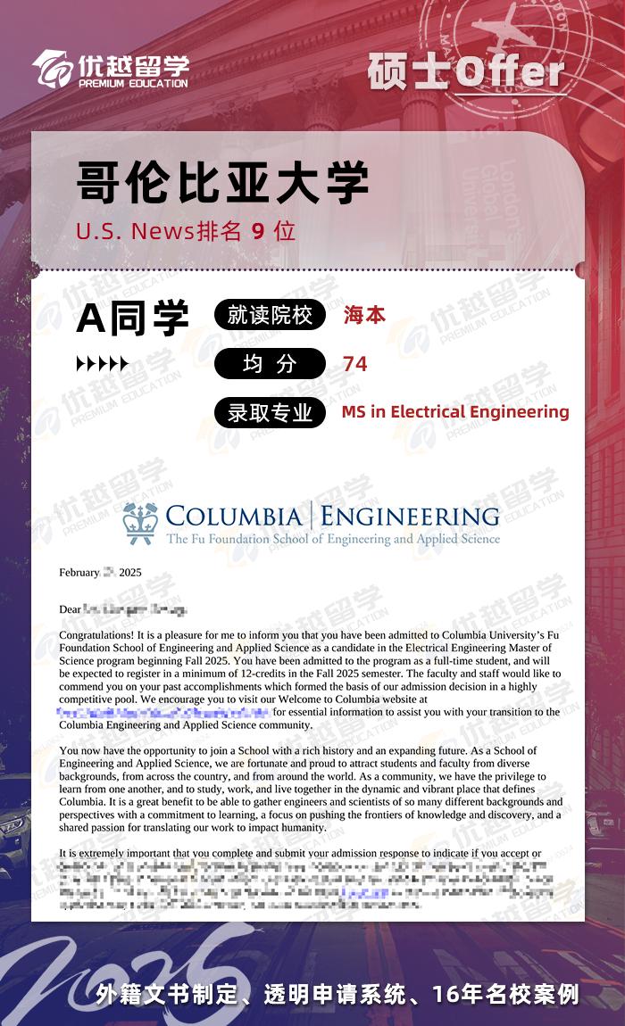 以上是【美國碩士留學offer來襲!【哥倫比亞大學】電氣工程專業】相關的全部內容,查看更多【offer榜單】、【名校案例】相關資訊可前往【優越留學】首頁!世界名校申請,找優越留學!選校定校、申請規劃、文書寫作、背景提升、方案定制一套搞定!點擊【在線咨詢】,優越留學顧問24h在線為您一對一解答!