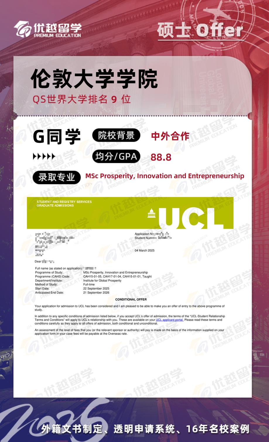 恭喜優越學員碩士研究生申請首戰告捷,拿下UCL繁榮、創新和創業碩士offer。接下來,就跟優越君一起看看這位同學的上岸歷程~