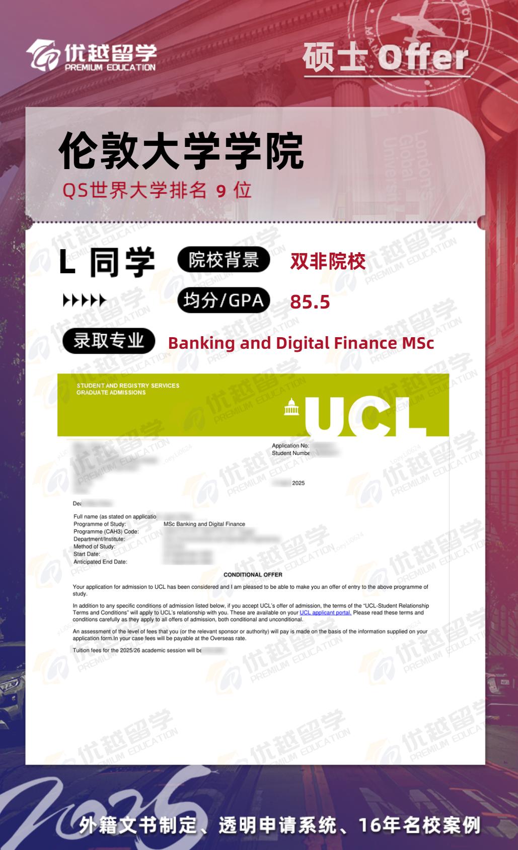 以上是【25fall英國(guó)碩士offer:雙非錄取【倫敦大學(xué)學(xué)院UCL】銀行與數(shù)字金融專業(yè)】相關(guān)的全部?jī)?nèi)容,查看更多【offer榜單】、【名校案例】相關(guān)資訊可前往【優(yōu)越留學(xué)】首頁(yè)!世界名校申請(qǐng),找優(yōu)越留學(xué)!選校定校、申請(qǐng)規(guī)劃、文書寫作、背景提升、方案定制一套搞定!點(diǎn)擊【在線咨詢】,優(yōu)越留學(xué)顧問(wèn)24h在線為您一對(duì)一解答!