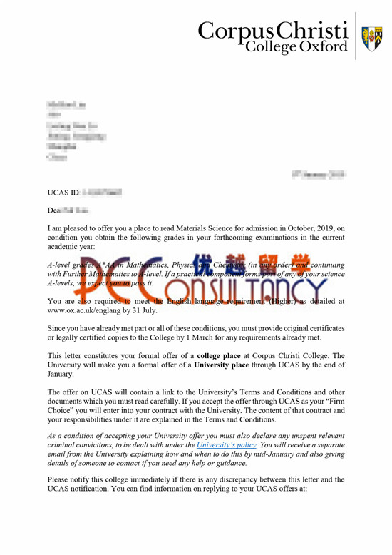 2019年offer:恭喜吳同學獲得牛津大學(世界排名:4)材料科學專業本科通知書