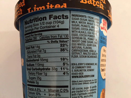 再來一個圖,這個是英國某冰淇淋品牌的Serving Size:1/2 cup,104g,意思是主張每次攝入不超越104g冰淇淋,不然長胖我不擔任哦!